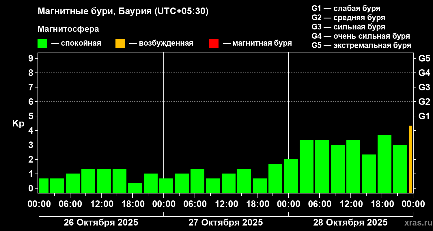 Изменения геомагнитного индекса Kp с 26 по 28 октября 2025 года для средних широт