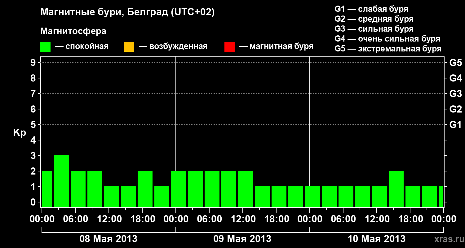 Изменения геомагнитного индекса Kp с 8 по 10 мая 2013 года для средних широт