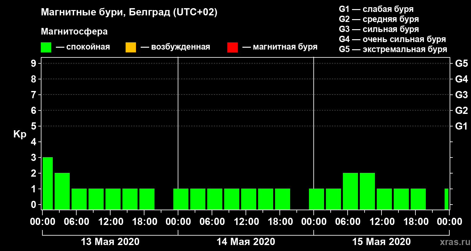 Изменения геомагнитного индекса Kp с 13 по 15 мая 2020 года для средних широт