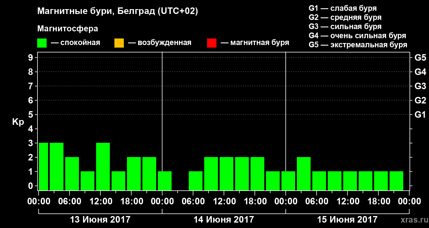 Изменения геомагнитного индекса Kp с 13 по 15 июня 2017 года для средних широт