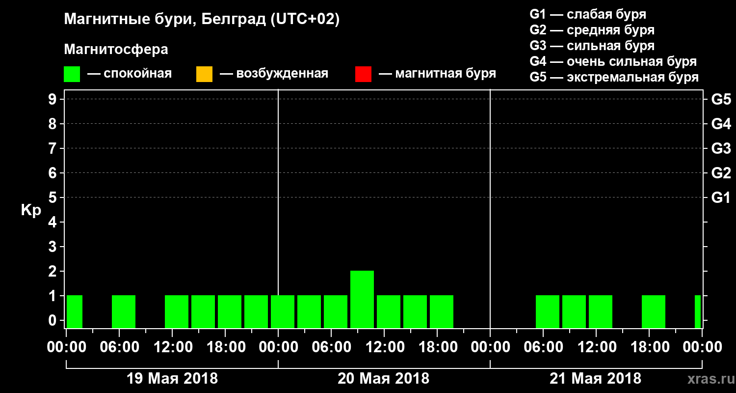 Изменения геомагнитного индекса Kp с 19 по 21 мая 2018 года для средних широт