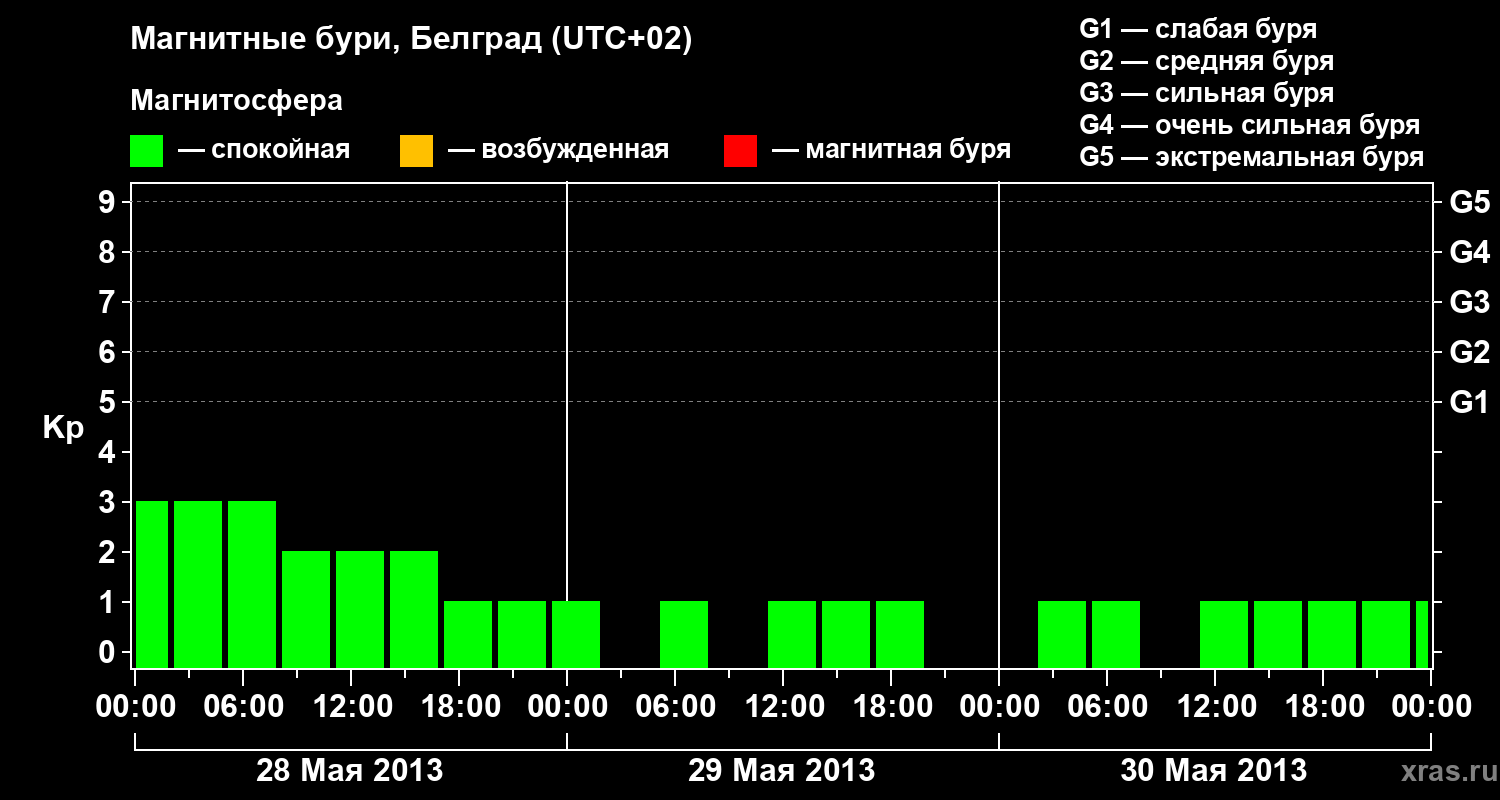 Изменения геомагнитного индекса Kp с 28 по 30 мая 2013 года для средних широт