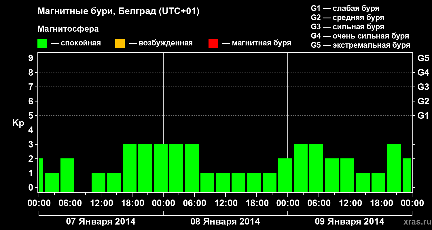 Изменения геомагнитного индекса Kp с 7 по 9 января 2014 года для средних широт