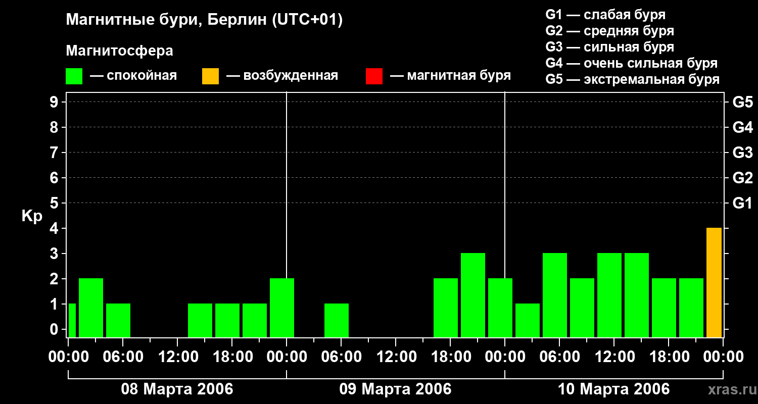 Изменения геомагнитного индекса Kp с 8 по 10 марта 2006 года для средних широт