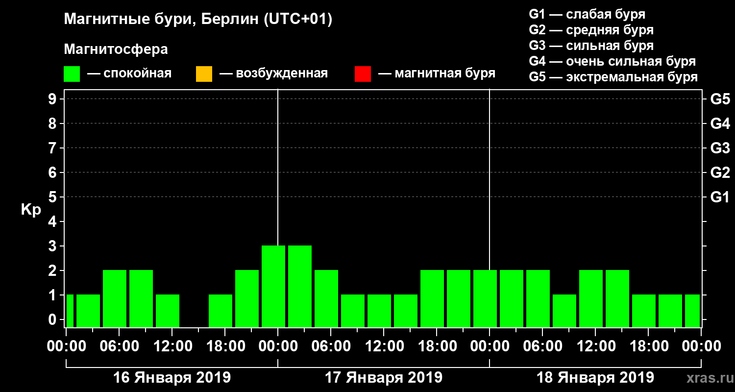 Изменения геомагнитного индекса Kp с 16 по 18 января 2019 года для средних широт