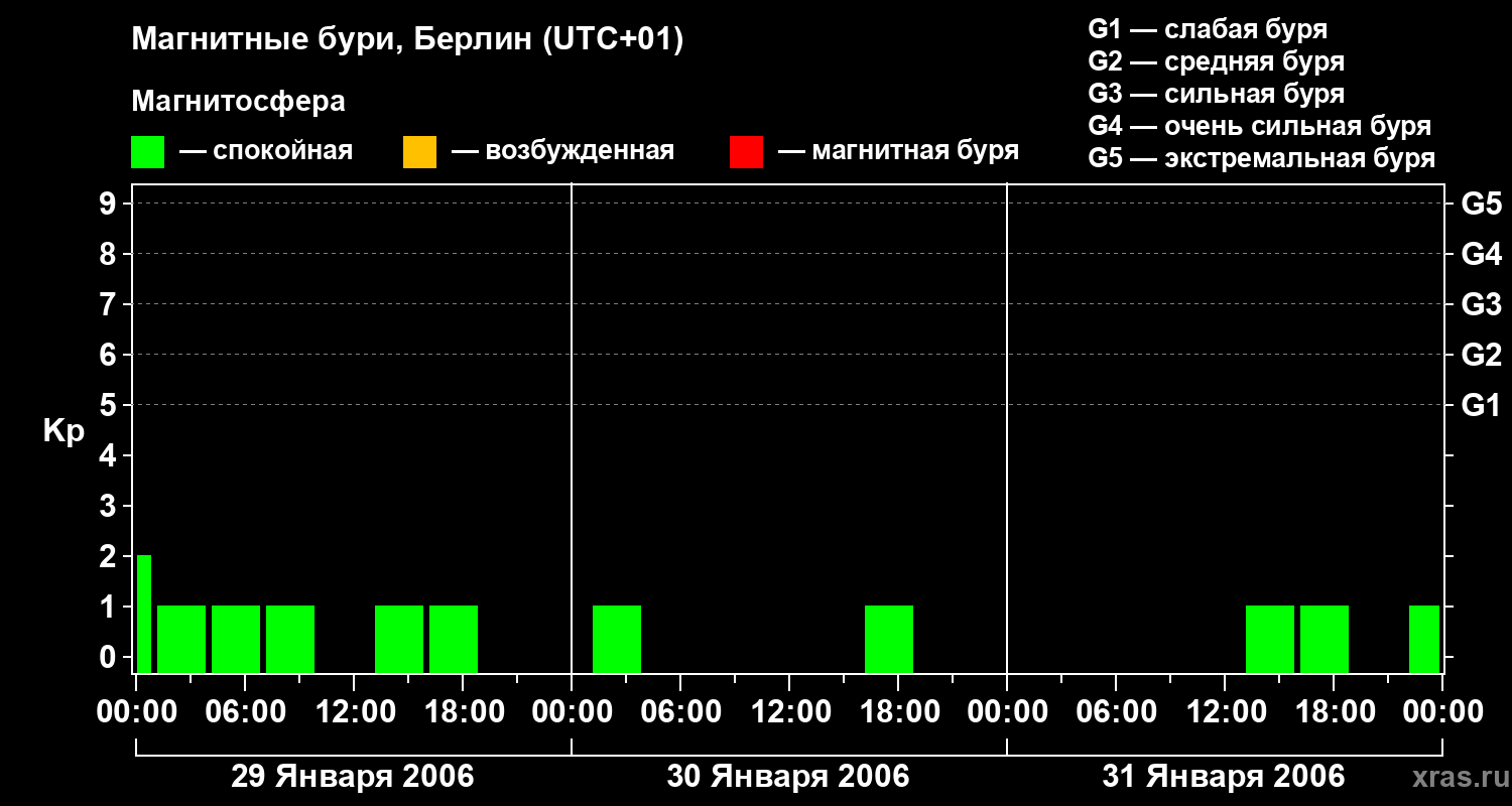 Изменения геомагнитного индекса Kp с 29 по 31 января 2006 года для средних широт