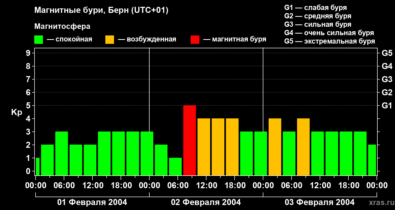 Изменения геомагнитного индекса Kp с 1 по 3 февраля 2004 года для средних широт