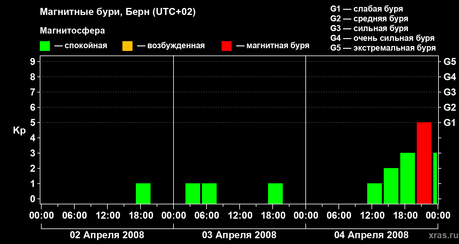 Изменения геомагнитного индекса Kp с 2 по 4 апреля 2008 года для средних широт