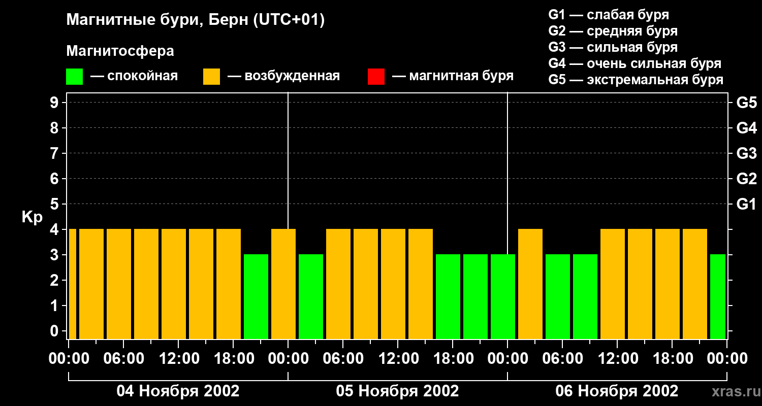 Изменения геомагнитного индекса Kp с 4 по 6 ноября 2002 года для средних широт