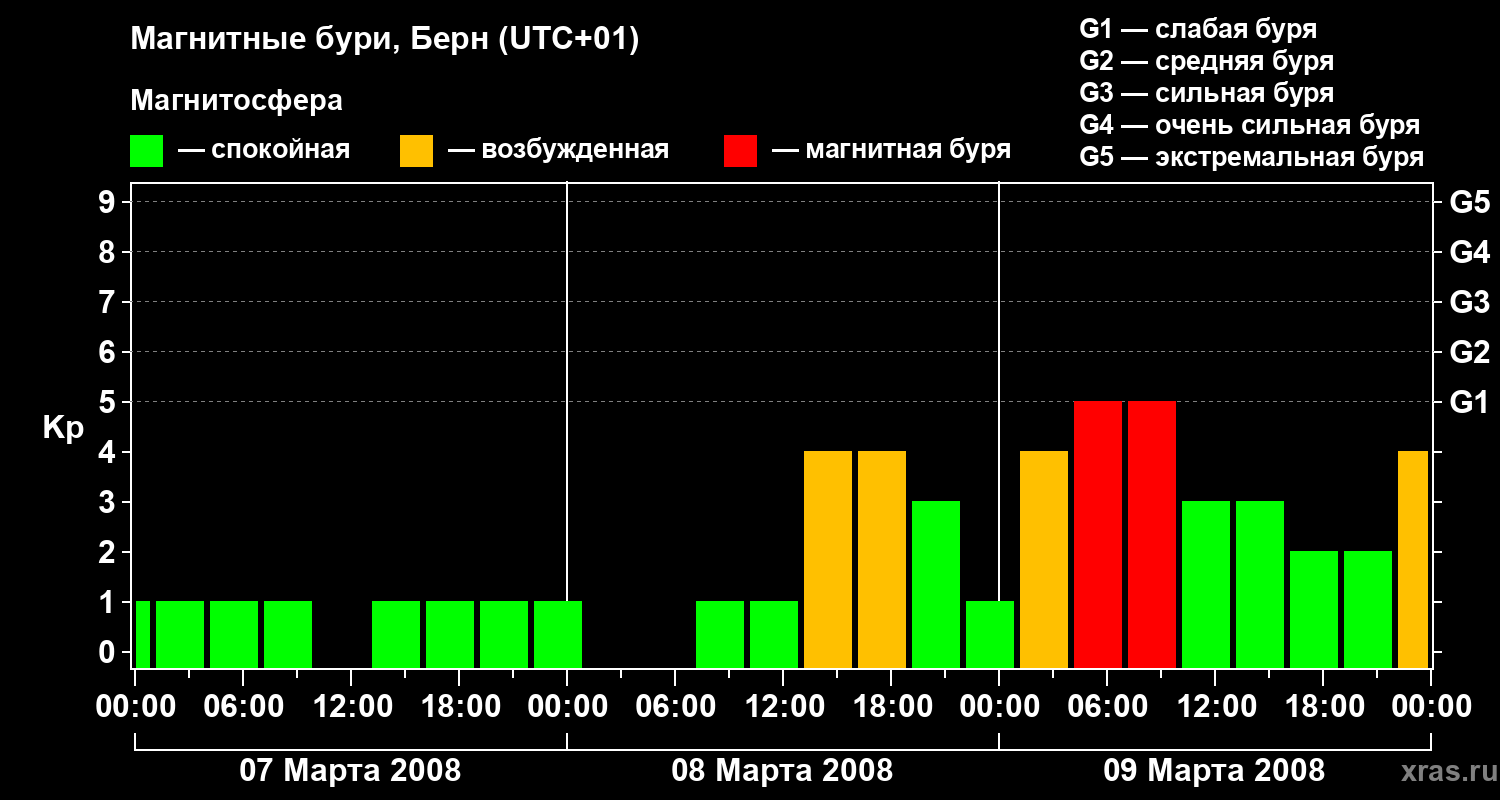 Изменения максимального суточного геомагнитного индекса Kp в марте 2008 года для средних широт