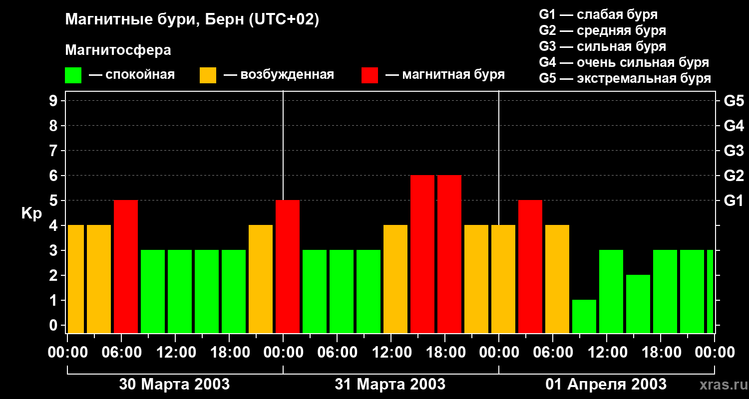 Изменения геомагнитного индекса Kp с 30 марта по 1 апреля 2003 года для средних широт