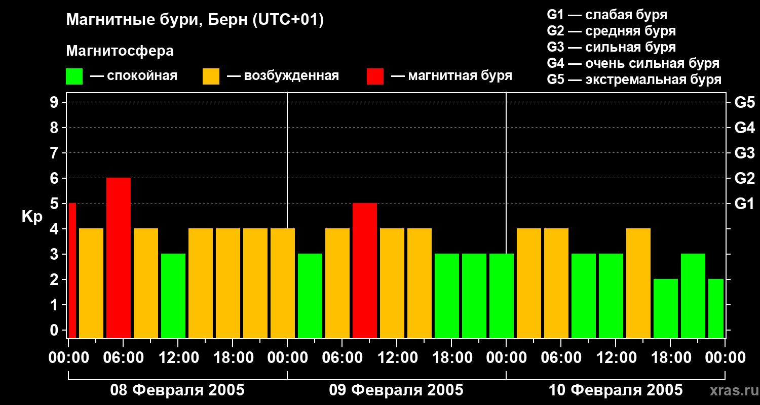 Изменения геомагнитного индекса Kp с 8 по 10 февраля 2005 года для средних широт