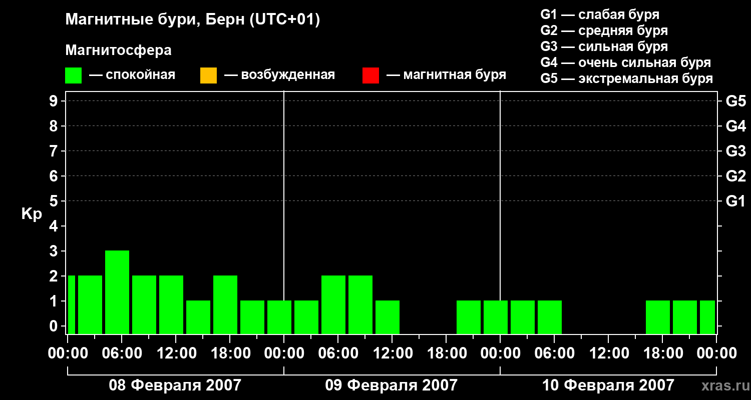 Изменения геомагнитного индекса Kp с 8 по 10 февраля 2007 года для средних широт