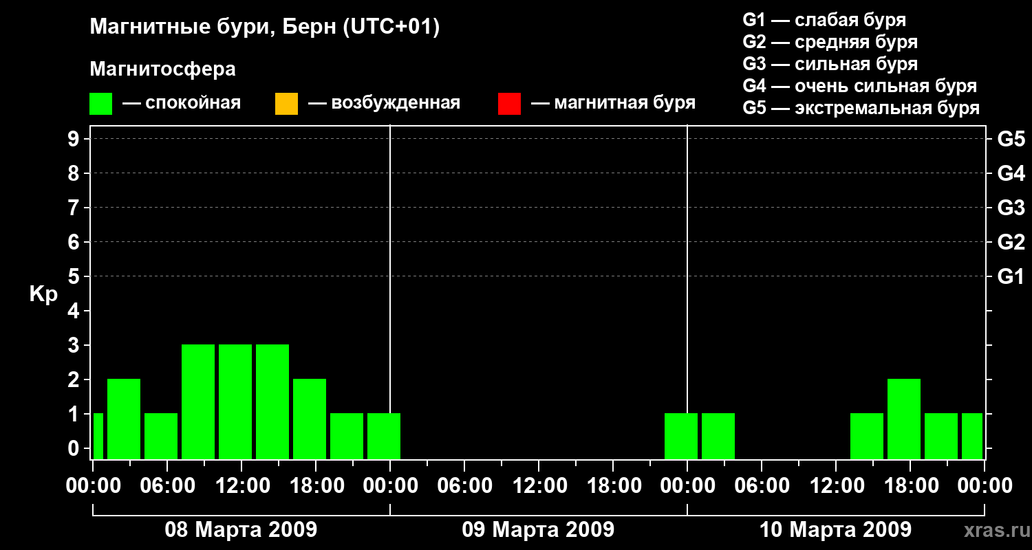 Изменения геомагнитного индекса Kp с 8 по 10 марта 2009 года для средних широт