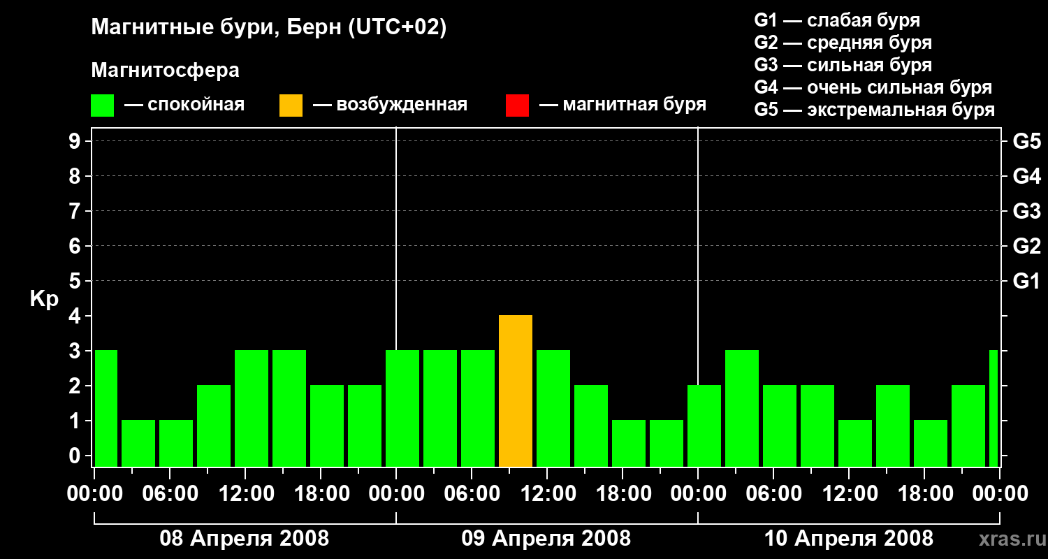 Изменения геомагнитного индекса Kp с 8 по 10 апреля 2008 года для средних широт