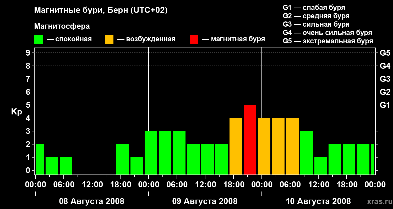 Изменения геомагнитного индекса Kp с 8 по 10 августа 2008 года для средних широт