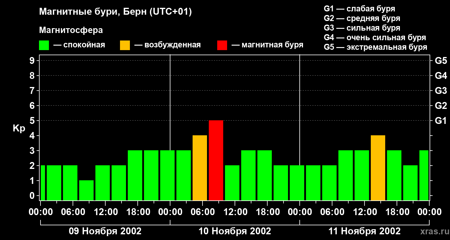Изменения геомагнитного индекса Kp с 9 по 11 ноября 2002 года для средних широт