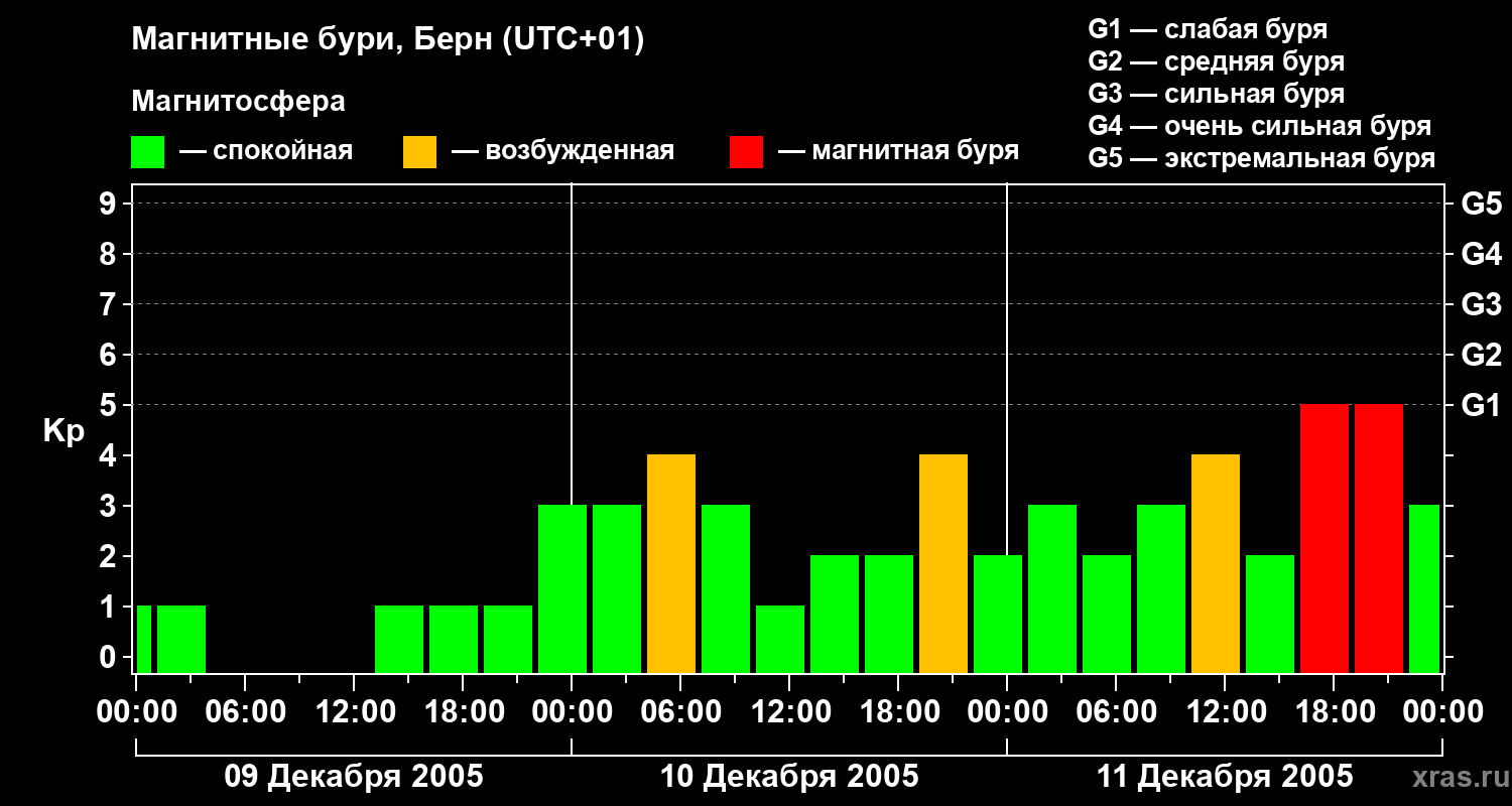 Изменения геомагнитного индекса Kp с 9 по 11 декабря 2005 года для средних широт