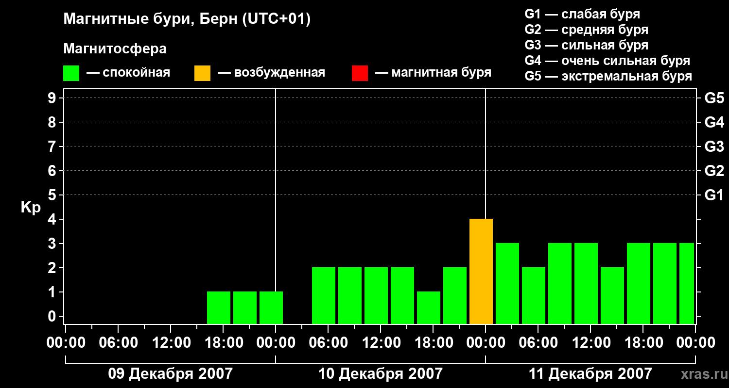 Изменения геомагнитного индекса Kp с 9 по 11 декабря 2007 года для средних широт