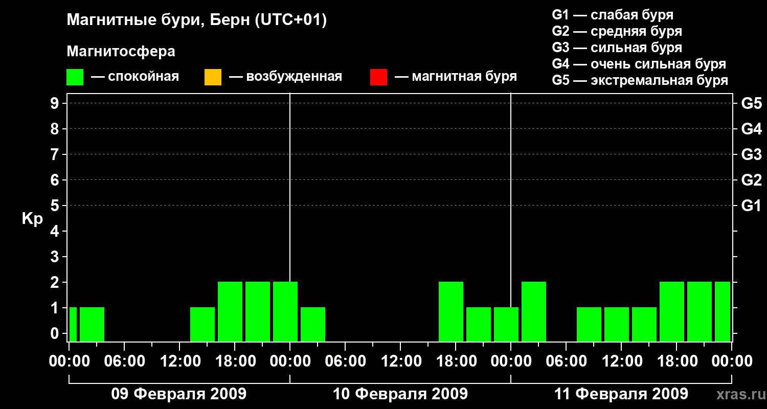 Изменения геомагнитного индекса Kp с 9 по 11 февраля 2009 года для средних широт