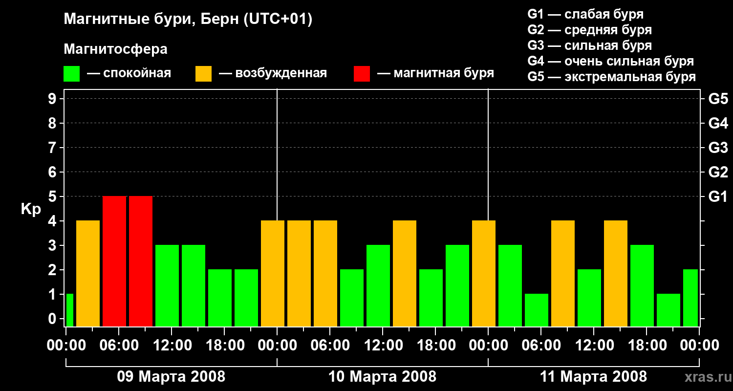 Изменения геомагнитного индекса Kp с 9 по 11 марта 2008 года для средних широт