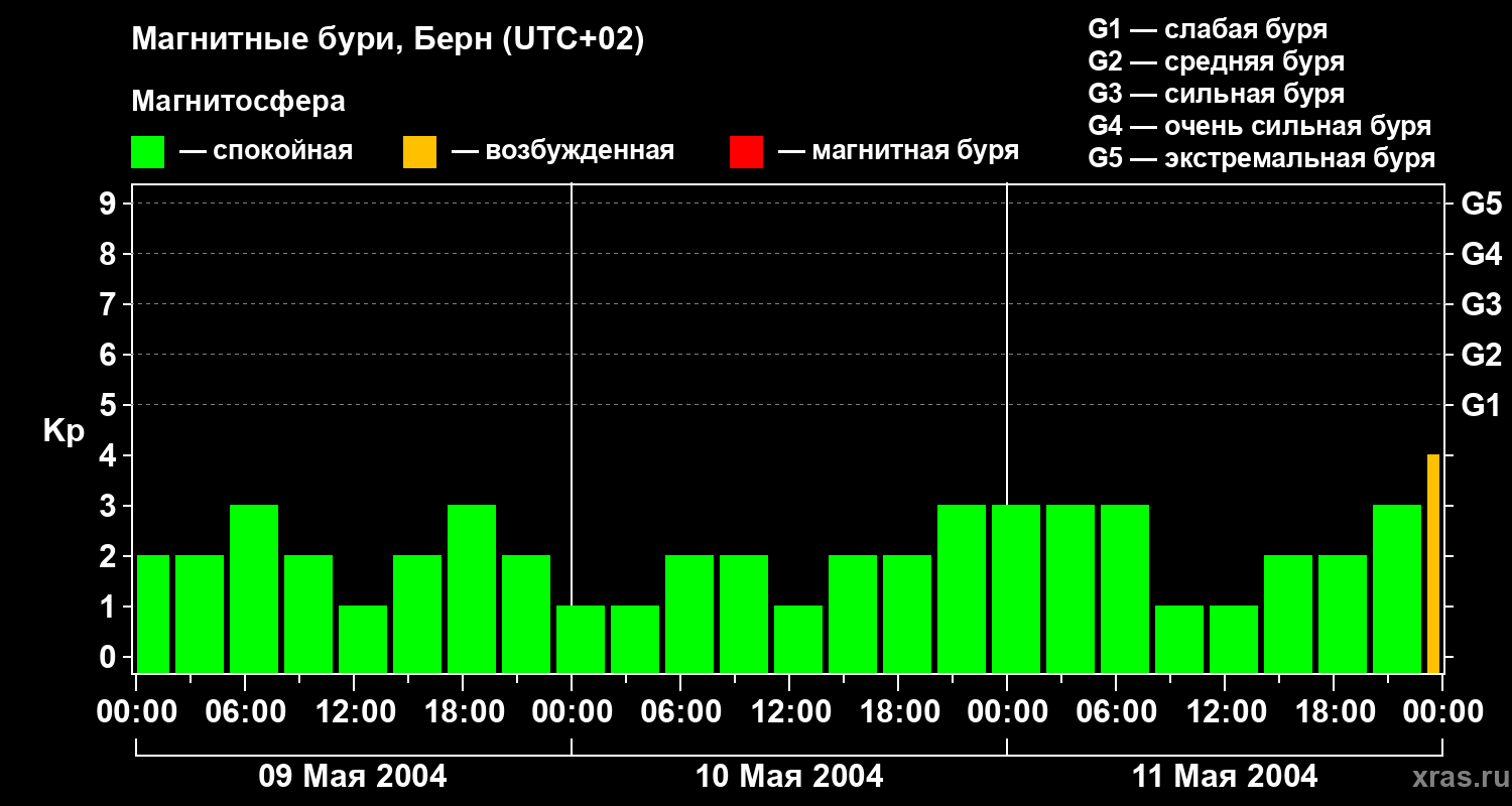 Изменения геомагнитного индекса Kp с 9 по 11 мая 2004 года для средних широт