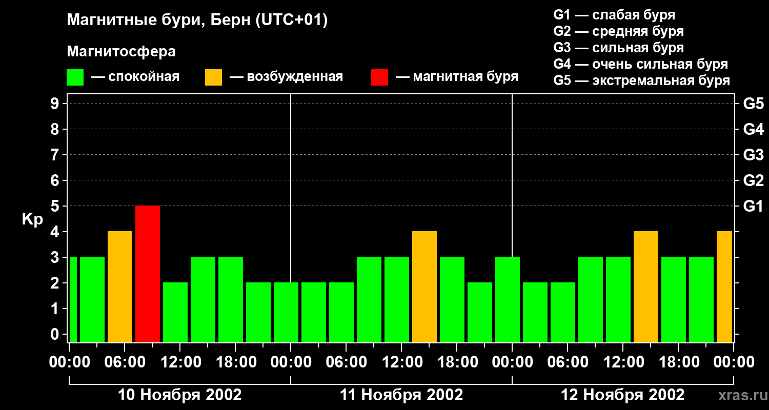Изменения геомагнитного индекса Kp с 10 по 12 ноября 2002 года для средних широт