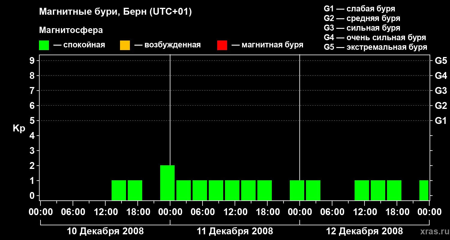 Изменения геомагнитного индекса Kp с 10 по 12 декабря 2008 года для средних широт