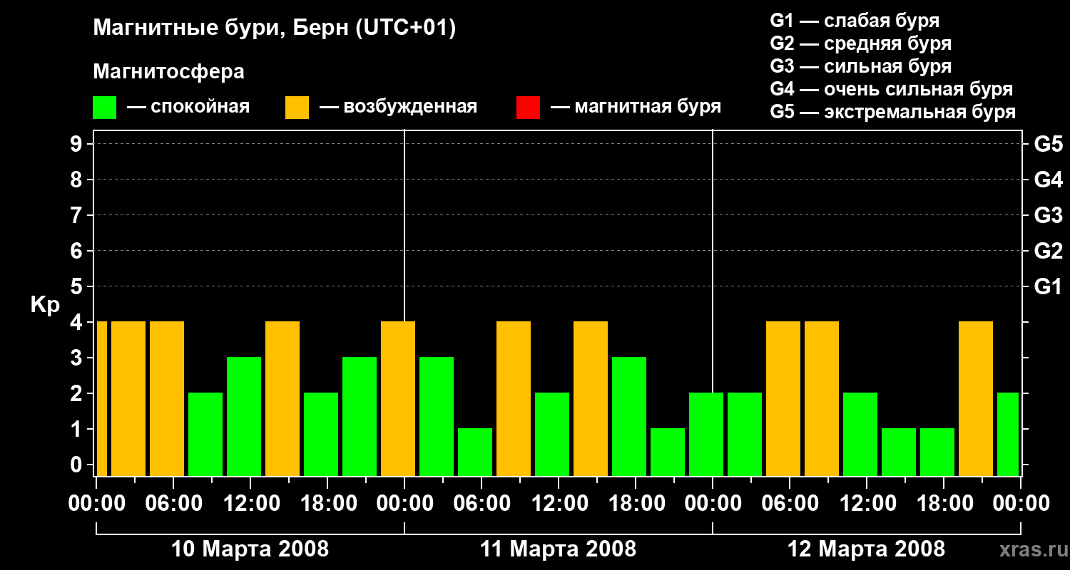 Изменения геомагнитного индекса Kp с 10 по 12 марта 2008 года для средних широт