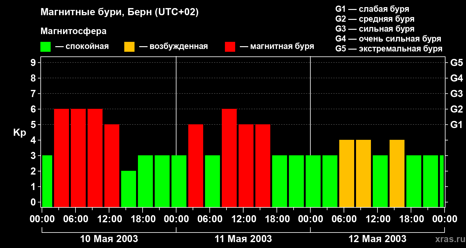 Изменения геомагнитного индекса Kp с 10 по 12 мая 2003 года для средних широт