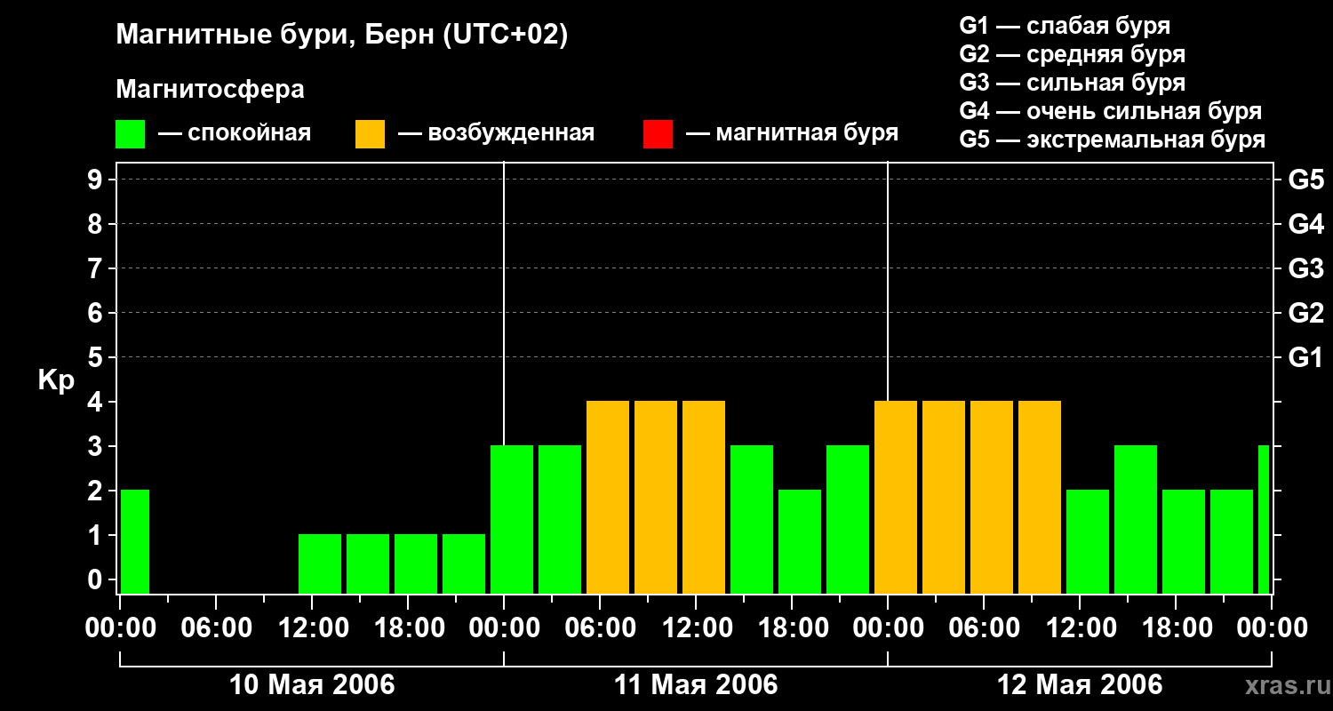 Изменения геомагнитного индекса Kp с 10 по 12 мая 2006 года для средних широт