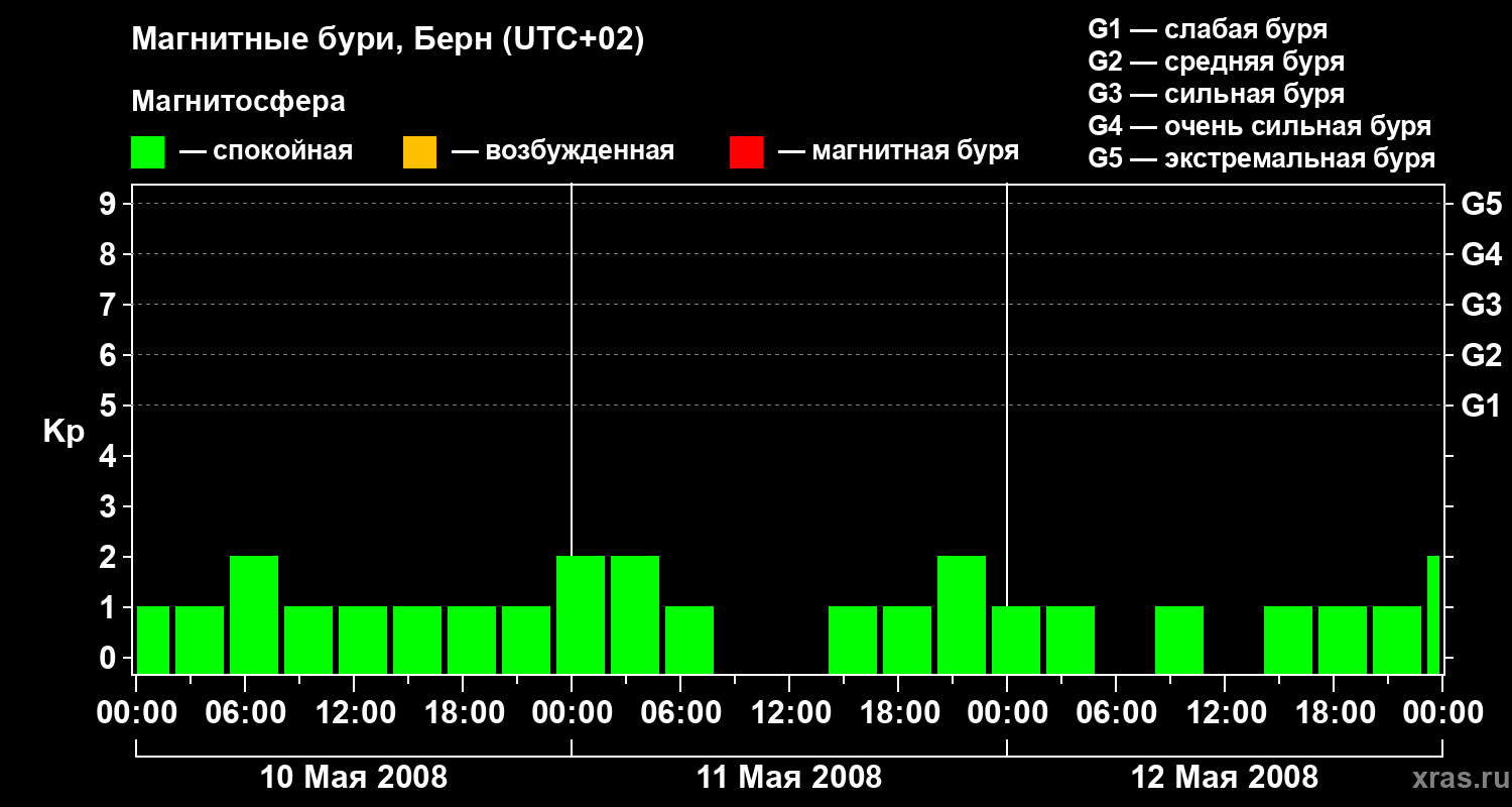 Изменения геомагнитного индекса Kp с 10 по 12 мая 2008 года для средних широт