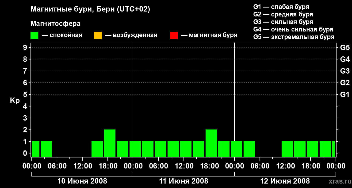 Изменения геомагнитного индекса Kp с 10 по 12 июня 2008 года для средних широт