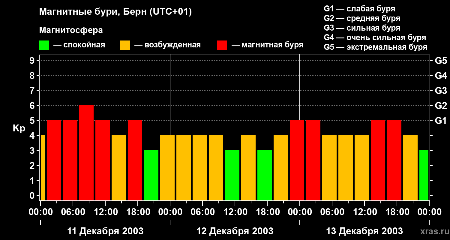 Изменения геомагнитного индекса Kp с 11 по 13 декабря 2003 года для средних широт
