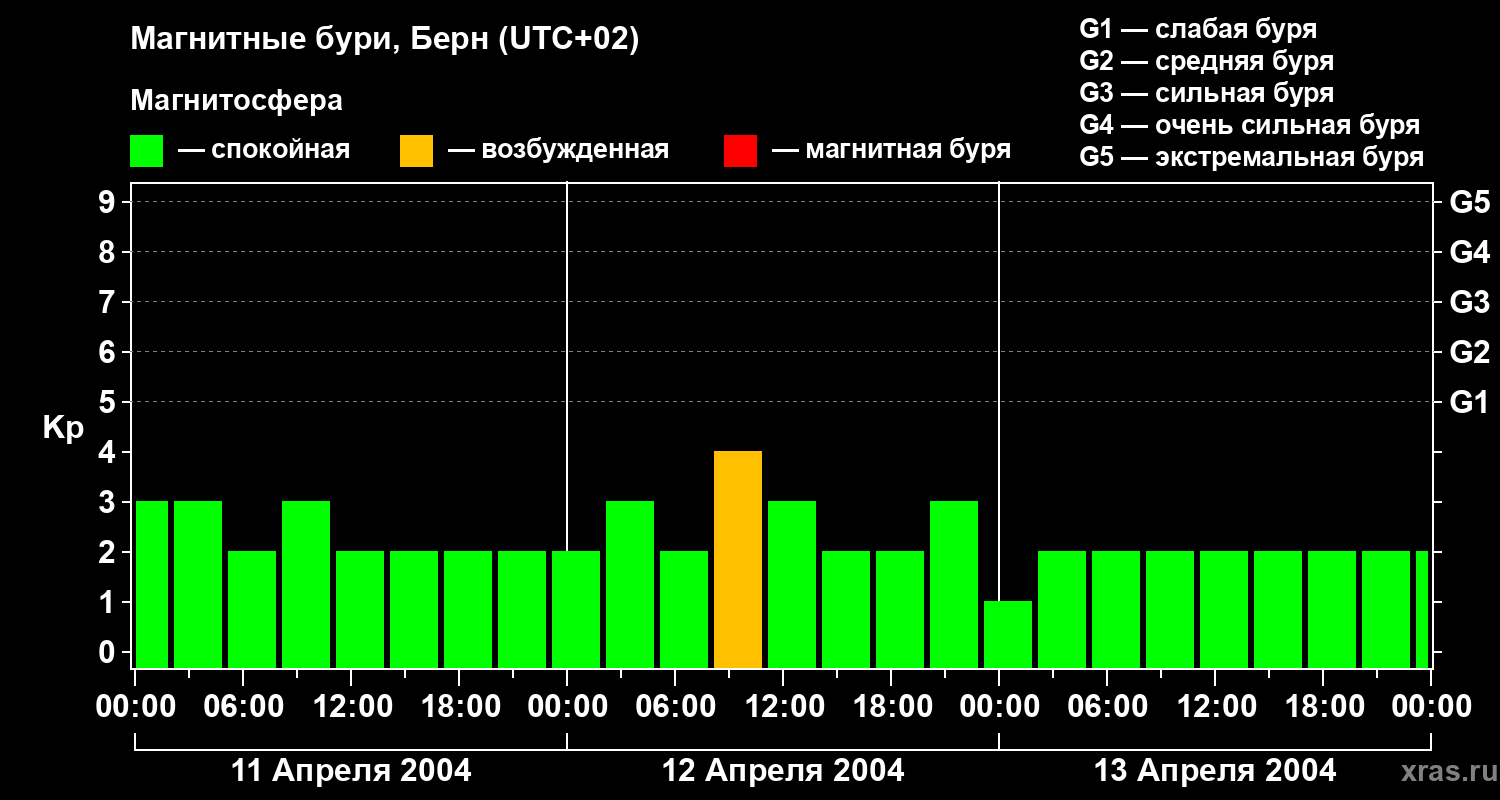Изменения геомагнитного индекса Kp с 11 по 13 апреля 2004 года для средних широт