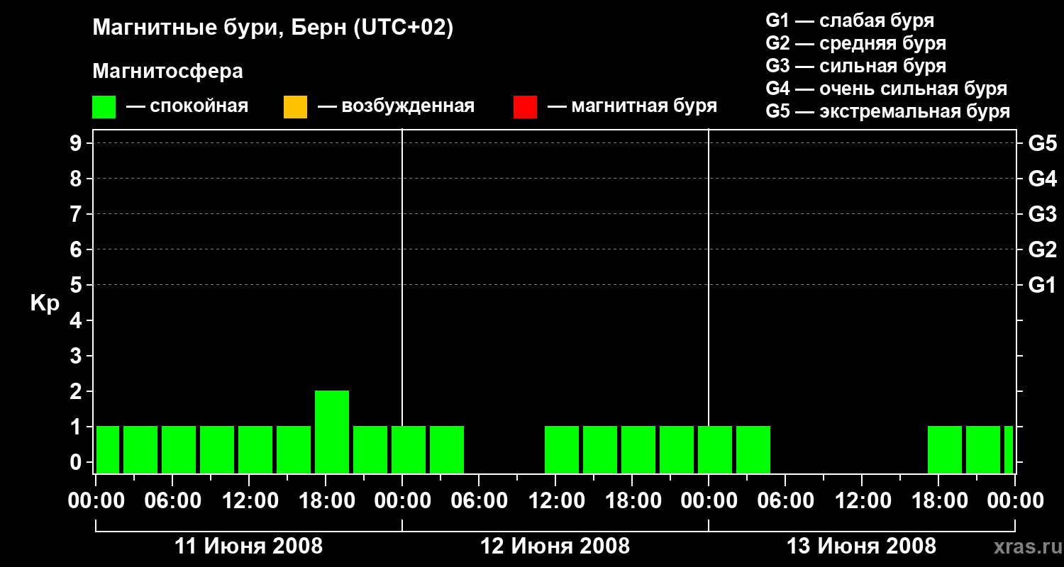 Изменения геомагнитного индекса Kp с 11 по 13 июня 2008 года для средних широт