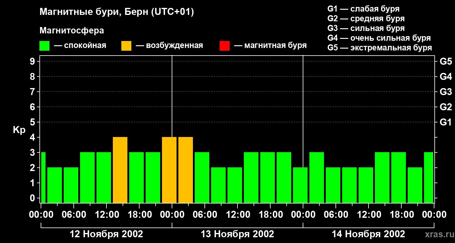 Изменения геомагнитного индекса Kp с 12 по 14 ноября 2002 года для средних широт
