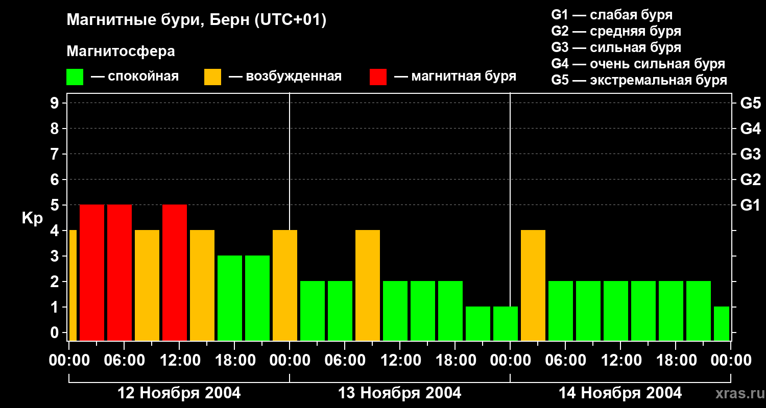 Изменения геомагнитного индекса Kp с 12 по 14 ноября 2004 года для средних широт