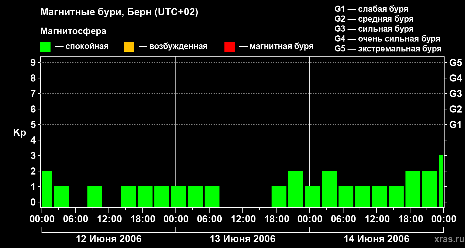Изменения геомагнитного индекса Kp с 12 по 14 июня 2006 года для средних широт