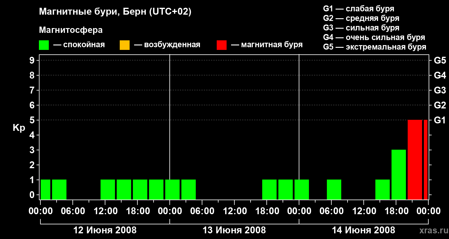 Изменения геомагнитного индекса Kp с 12 по 14 июня 2008 года для средних широт