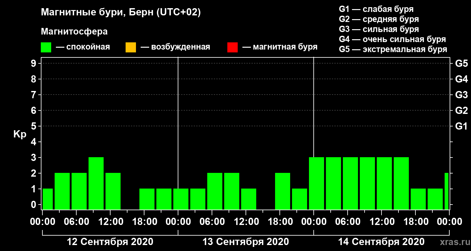 Изменения геомагнитного индекса Kp с 12 по 14 сентября 2020 года для средних широт