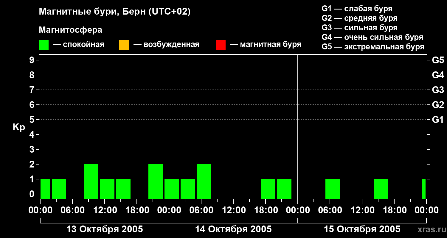 Изменения геомагнитного индекса Kp с 13 по 15 октября 2005 года для средних широт