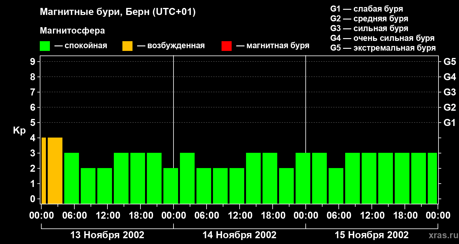 Изменения геомагнитного индекса Kp с 13 по 15 ноября 2002 года для средних широт