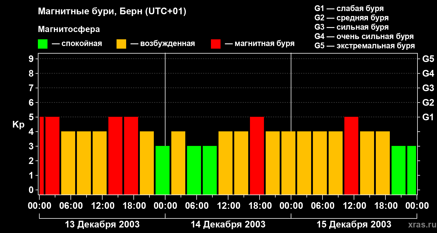 Изменения геомагнитного индекса Kp с 13 по 15 декабря 2003 года для средних широт