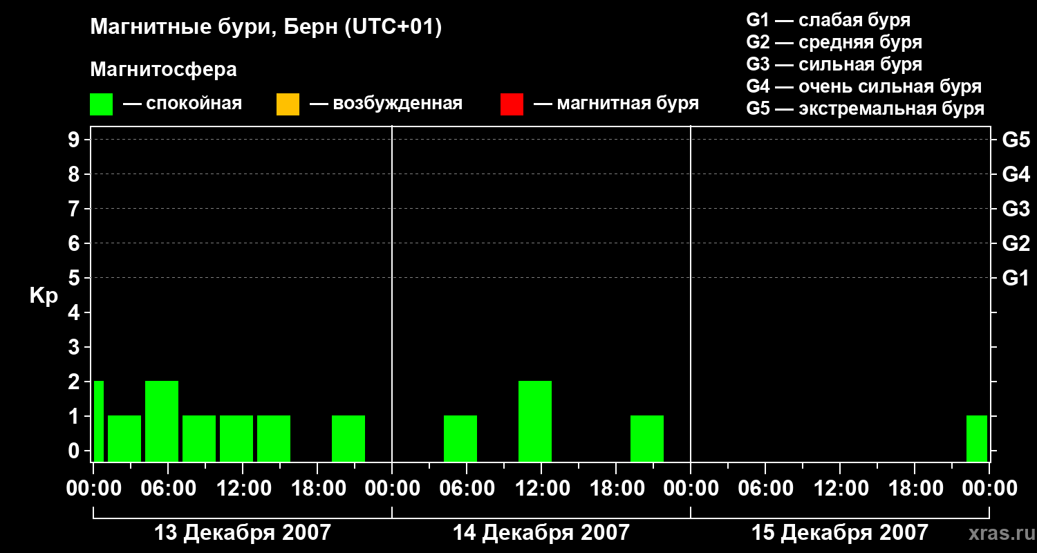 Изменения геомагнитного индекса Kp с 13 по 15 декабря 2007 года для средних широт