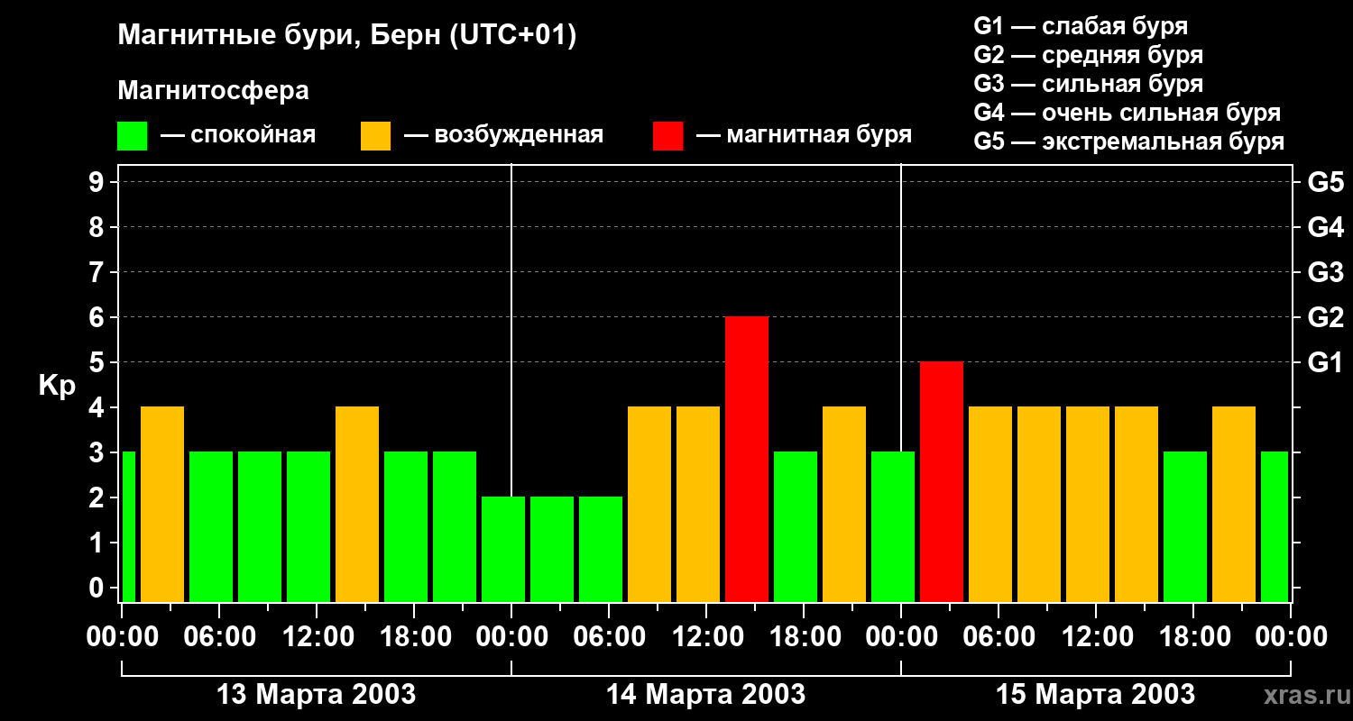 Изменения геомагнитного индекса Kp с 13 по 15 марта 2003 года для средних широт