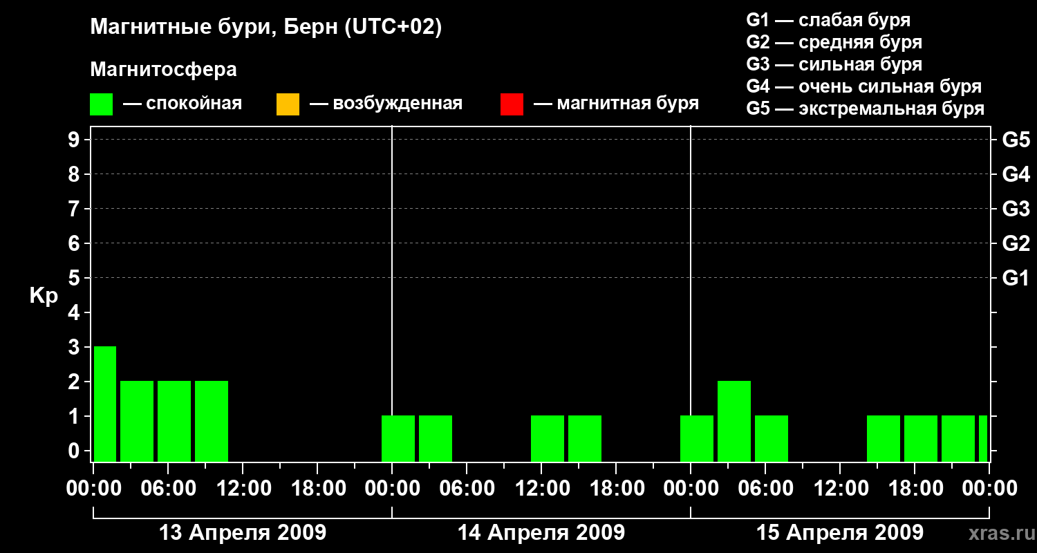 Изменения геомагнитного индекса Kp с 13 по 15 апреля 2009 года для средних широт