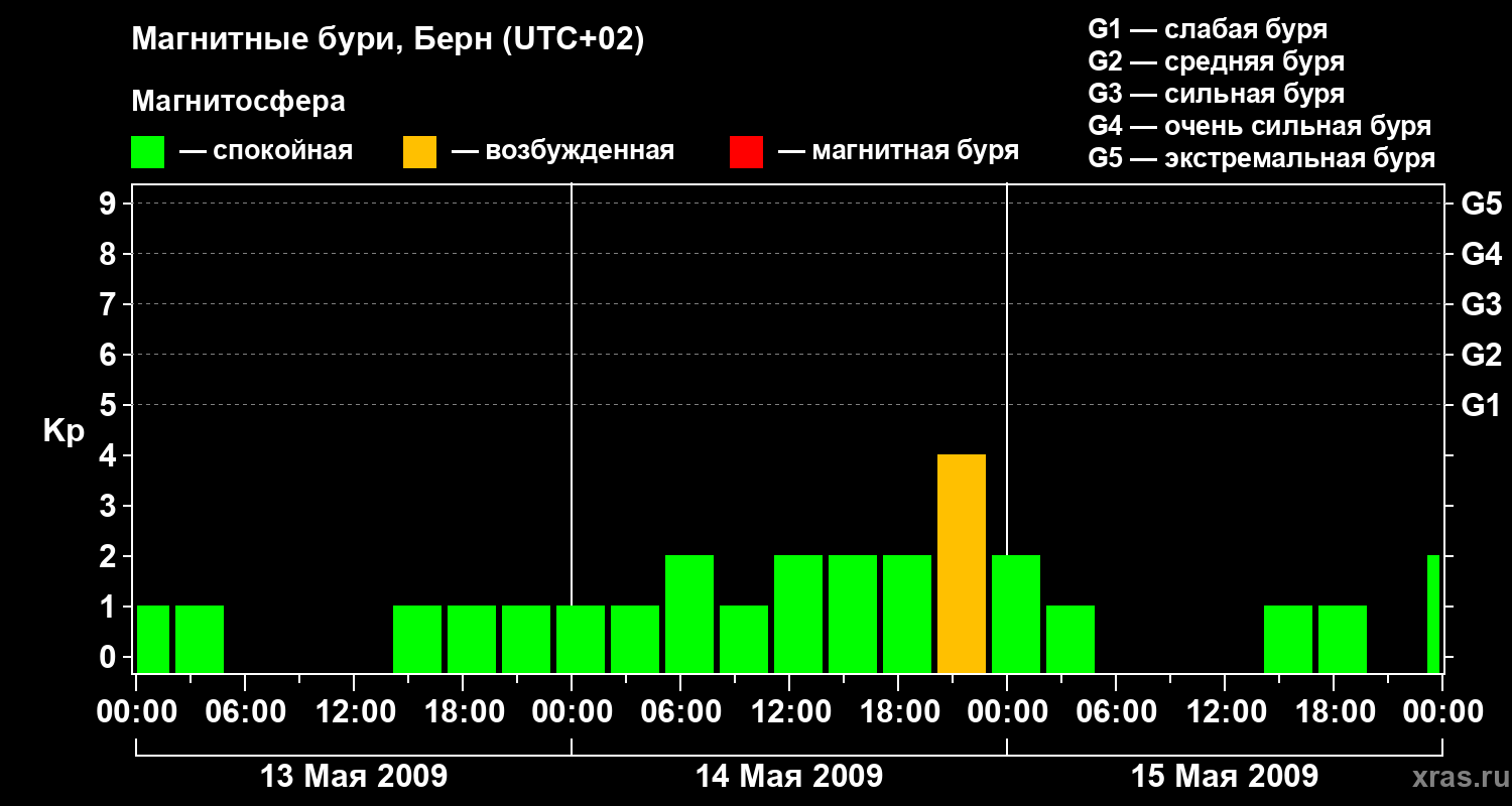 Изменения геомагнитного индекса Kp с 13 по 15 мая 2009 года для средних широт