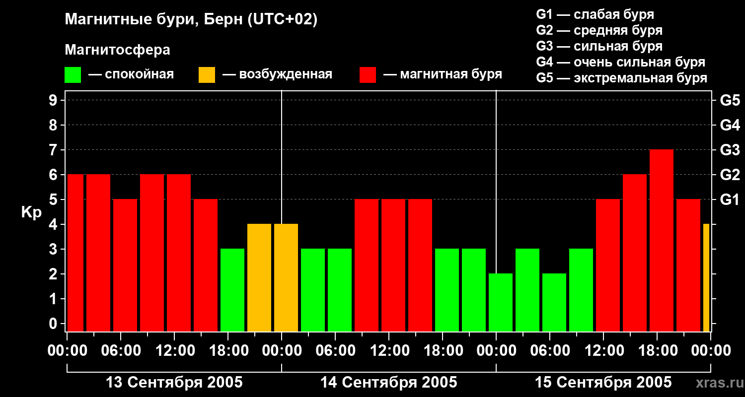Изменения геомагнитного индекса Kp с 13 по 15 сентября 2005 года для средних широт