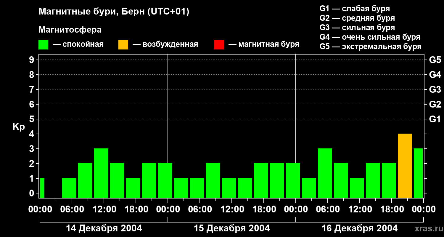 Изменения геомагнитного индекса Kp с 14 по 16 декабря 2004 года для средних широт
